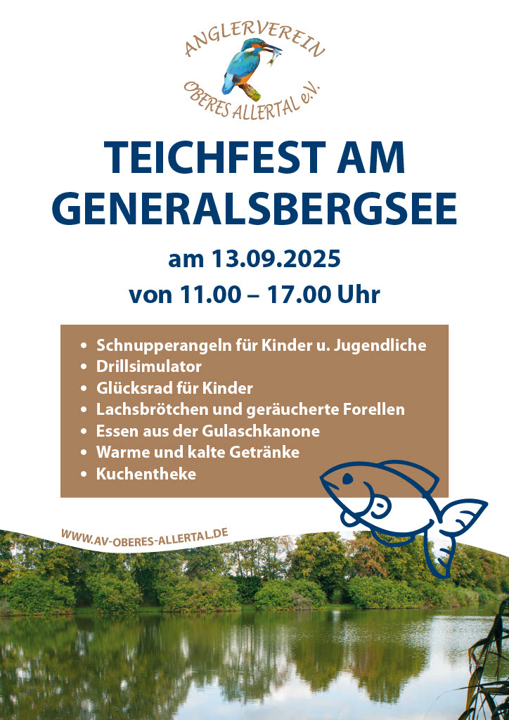 hiermit möchten wir Alle recht herzlich zum „Teichfest am Generalsbergsee“ am 13.09.2025, in der Zeit von 11.00 – 17.00 Uhr, recht herzlich einladen.