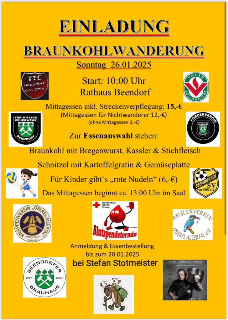im Rahmen unserer Gemeinschaft mit den Vereinen der Gemeinde Beendorf möchten wir euch zur Braunkohlwanderung am 26.01.2025 einladen. Treffpunkt ist am Rathaus in Beendorf um 10.00Uhr.