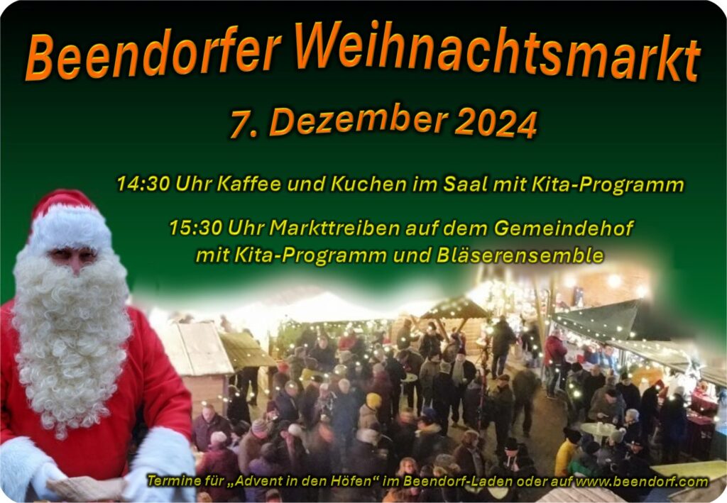 hiermit möchten wir Euch recht herzlich zum „Beendorfer Weihnachtsmarkt “ am 07.12.2024, ab 14.30 Uhr, recht herzlich einladen.